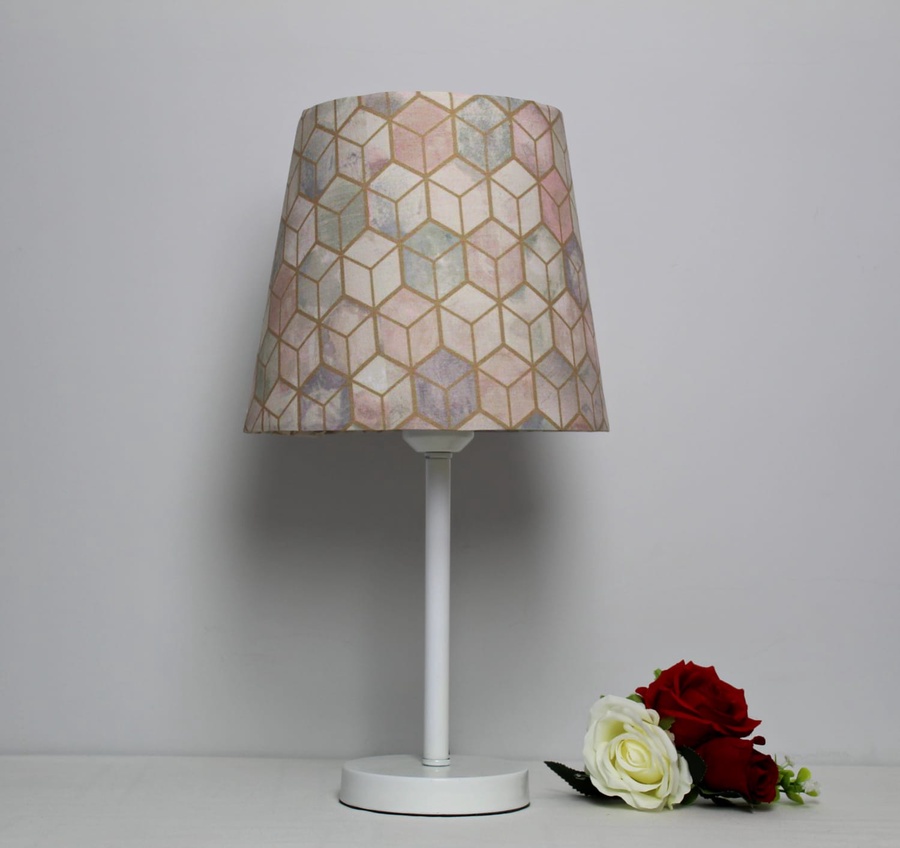 اباجورة غرفة اطفال تصميم حديث عصري قاعدة معدن لون ابيض ارتفاع 45 سم شابوة قماش مرسوم 23 سم